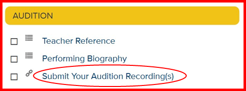 - Scroll down the page to the golden “Audition” banner and click on Submit Your Audition Recording(s).