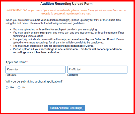 - On the Audition Recording Upload Form, read the submission guidelines and fill out the information before clicking Submit Audition Recording(s).