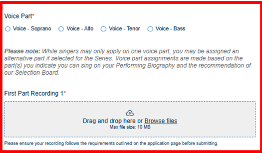 - Choose the voice part or instrument for which you are submitting your audition and upload your audio recording through the First Part Recording 1 box.